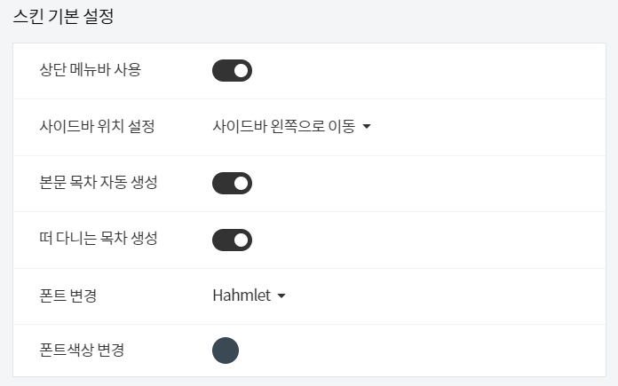 스킨 기본 설정에서 플로팅(떠다니는) 목차를 생성할 수 있습니다. 이 목차는 본문 상단에 고정된 목차와는 별개로 생성됩니다. 두 목차를 모두 보이게 하거나 한 목차만을 선택적으로 보이게 할 수 있습니다. (기본값:숨김)